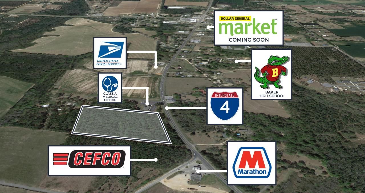 Now available is an approximately 1.5 acre parcel in Baker, FL with a new 20 year billboard ground lease! This property is zoned C-3 and allows for a number of commercial uses. There is a shared access with the new Cefco convenience store as well as the office building. Baker is growing area that lies just west of Crestview. Multiple commercial and residential developments are currently underway in Baker. Quick access to Highway 90, I-10, and Highway 85 make this site a great location for development.