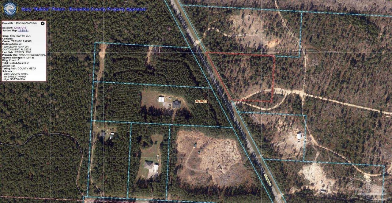 Welcome to 1400 Highway 97 in Molino, Florida - a rare opportunity to own over 4 acres of peaceful country land in an area that's rapidly growing with new neighborhoods, stores, and development nearby. This beautiful high-and-dry property offers the perfect blank canvas to build your dream home, barn dominium, or hobby farm, with plenty of room for gardens, animals, and outdoor living. Surrounded by mature trees and open skies, the land provides a sense of privacy and serenity while still offering quick access to Pensacola, Atmore, and major roads for an easy commute. Zoned for residential or agricultural use, this property gives you the...read more
