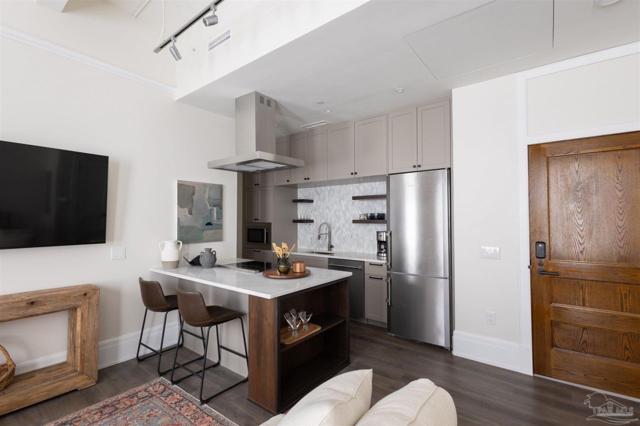 Downtown living at its best. The fabulous Brent Lofts condominiums are located at the epicenter of Pensacola's vibrant City center with numerous restaurants and entertainment venues within two blocks of the property. This is a one of a kind unit with custom features. A peninsula island anchors the very functional kitchen. The unit is located at the end of the hallway and overlooks the terrace below. Isolated from the noise of the street or parking lot. Fully furnished and available for the Lofts AIrBnb rental program. Perfect for full time urban living or just a weekend getaway this solid concrete and steel built is unmatched for character...read more