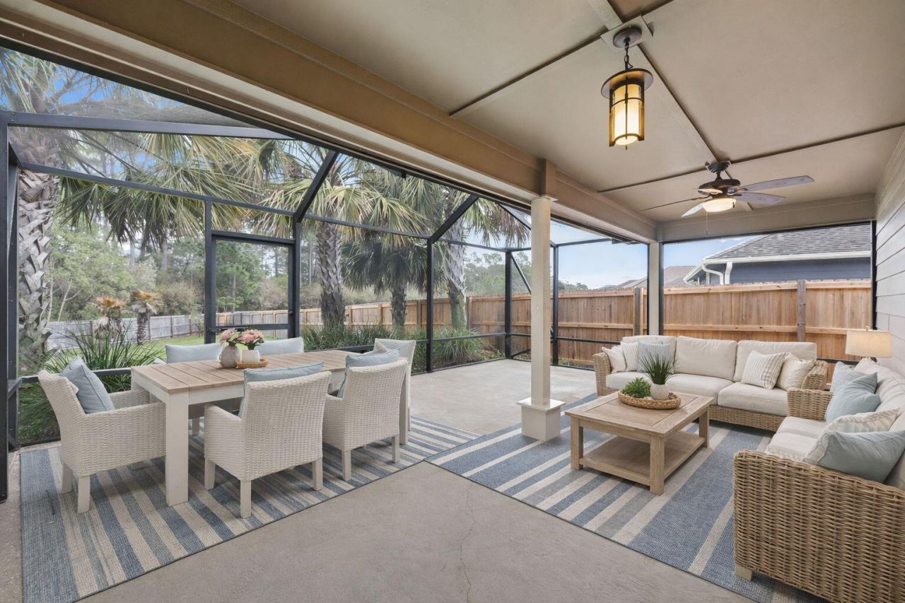 Lovely home now available in the Cottages at East River community of East Navarre. Just five minutes away from the beautiful white sands of Navarre Beach and twenty minutes to Hurlburt Field. Perfectly situated near the end of the street, the home is on a large lot over 200 feet deep with beautiful Florida landscaping and palm trees. There is a natural green space behind the home, which is the perfect setting to relax and enjoy the evening in the screened-in lanai. Inside features tall 10' ceilings, crown molding, trey ceilings and an open floorplan. The kitchen is immense, with beautiful granite countertops, a large breakfast bar, and an...read more