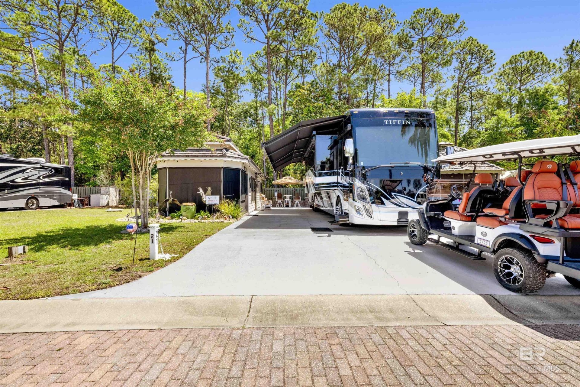 Welcome to Lot 21 at Terry Cove Motorcoach Resort, a premier gated 45-lot Class-A motorcoach community in the heart of Orange Beach. This beautifully improved property offers the perfect blend of luxury, convenience, and coastal lifestyle, featuring paved drives, lush landscaped common areas, and a well-maintained resort atmosphere. The 12' x 33' coach home offers approximately 396+/- square feet of thoughtfully designed living space with a private bedroom and bath with stack washer/dryer. The interior includes a well-appointed kitchen with refrigerator/freezer, drawer dishwasher, cooktop and microwave. The living and kitchen areas flow seamlessly...read more
