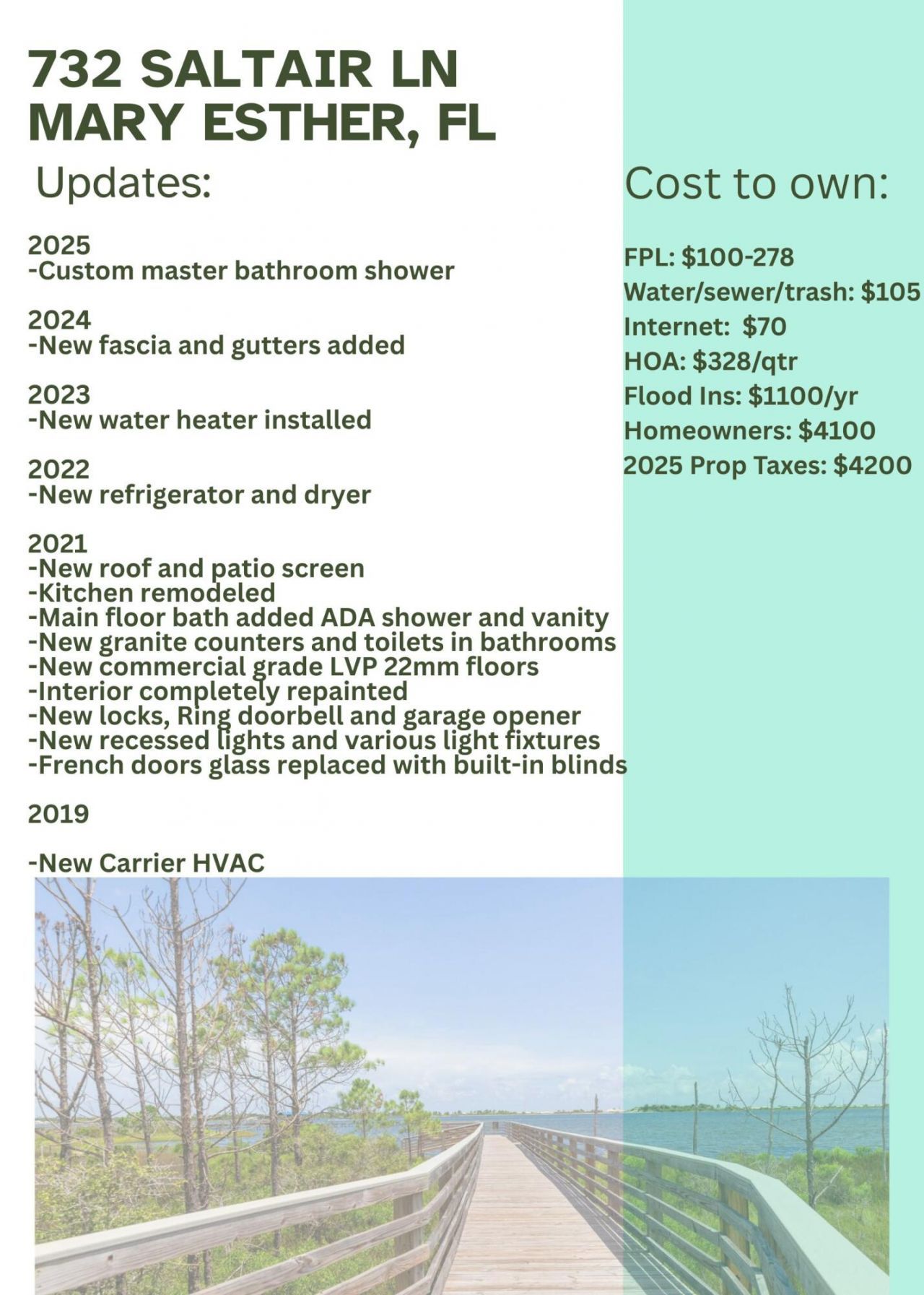 Waterfront Perfection on the Santa Rosa Sound marsh! Welcome to 732 Saltair Lane, a fully renovated coastal retreat offering 4 bedrooms and 3 full bathrooms with almost 2100 sq ft. Perfectly positioned on the marsh of the Santa Rosa Sound, this stunning property delivers breathtaking water views, serene sunsets, and the ultimate Florida lifestyle.No detail was overlooked in the recent renovation, featuring modern finishes, updated kitchens and baths, and a seamless blend of comfort and coastal elegance. The open living spaces and soaring ceiling are designed to maximize natural light and water views. The LVP flooring throughout with granite...read more
