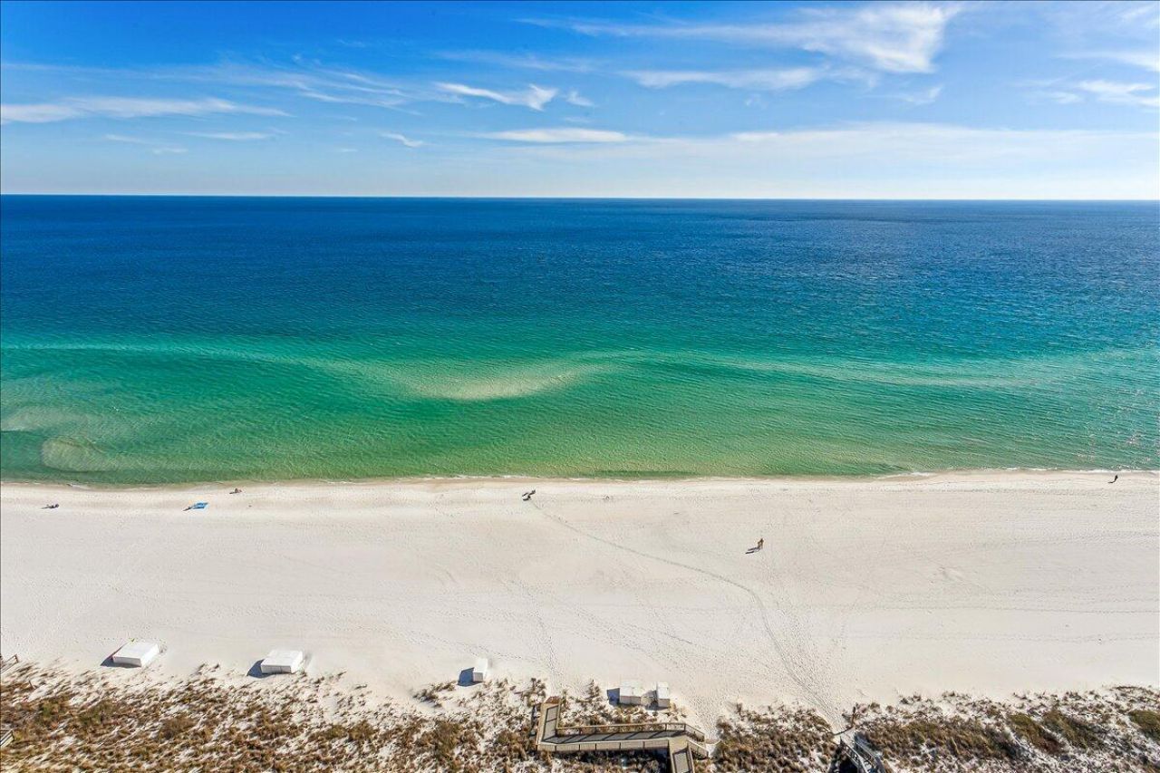 Refresh your spirit from the 18th floor with breathtaking Gulf-front views. Furnished 3-bedroom, 3-bath penthouse-level condominium offers views of sugar-white sands and emerald waters of the Gulf. Designed with comfort and style in mind, the open-concept living area features soaring 12-foot ceilings, crown molding, travertine tile flooring, spacious rooms, and expansive glass fronted balcony. Begin your mornings with coffee at sunrise and unwind in the evening with spectacular sunsets, all from the comfort of your balcony furnished with durable Polywood seating. This spacious residence also includes a versatile lockout unit with a kitchenette--ideal...read more